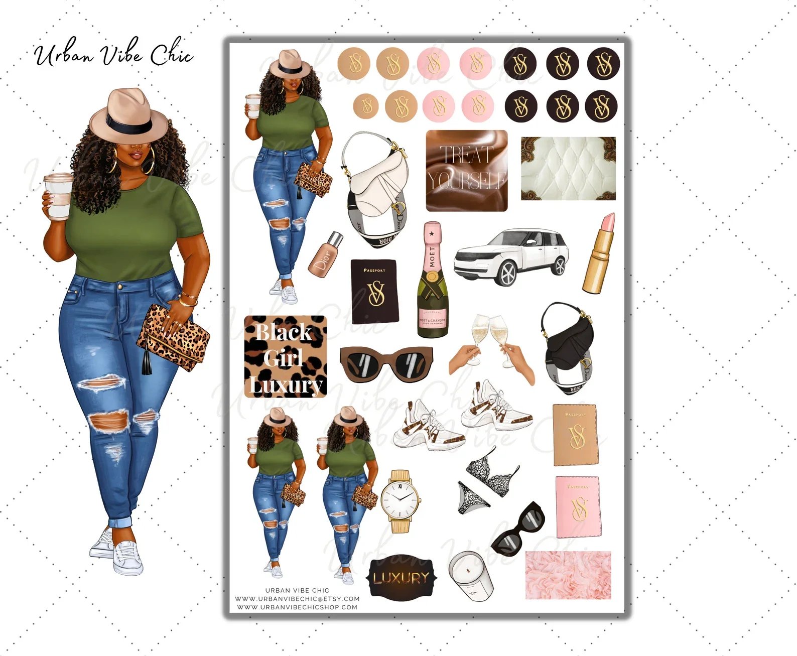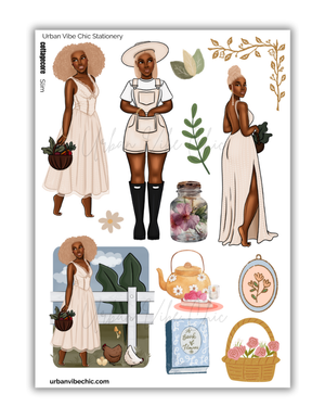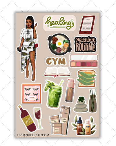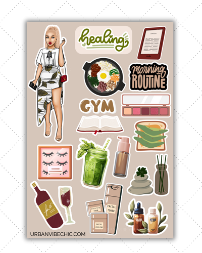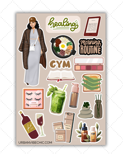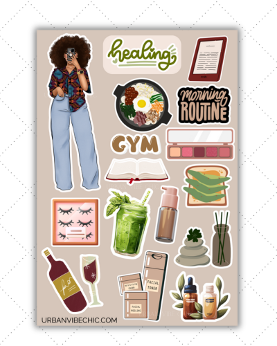 The Healing Energy Collection by Urban Vibe Chic is all about soft mornings, calm energy, and intentional living. Each sticker sheet celebrates the art of self-care — from skincare rituals and green smoothies to journaling and cozy robe moments.