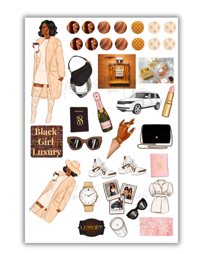 The Fashion Muse Series by Urban Vibe Chic Stationery celebrates the modern Black woman — bold, elegant, and effortlessly chic. Each sticker sheet features beautifully illustrated fashion dolls styled in luxe neutrals, soft textures, and timeless silhouettes.
